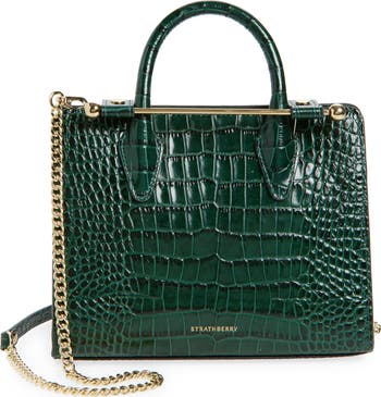 Handcrafted in Spain from croc-embossed leather, this scaled-tiny tote showcases a boxy structured silhouette secured with the label's signature bar closure. A removable chain-and-leather strap offers a hands-free carrying option.