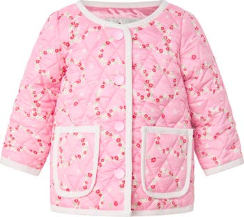 Introducing our Mini Daisy Bias Trim Jacket, a must-have for spring! This adorable lightweight quilted jacket in pink features a beautiful mini daisy print, rounded neckline, two patch pockets, and ivory trims. Perfect for everyday wear, it's a stylish and functional addition to any baby girl's wardrobe.
