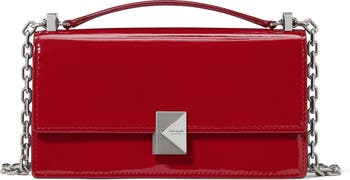 Iconic logo hardware highlights the glossy patent exterior of a structured bag suspended from a lustrous chain strap that converts from shoulder to crossbody wear.