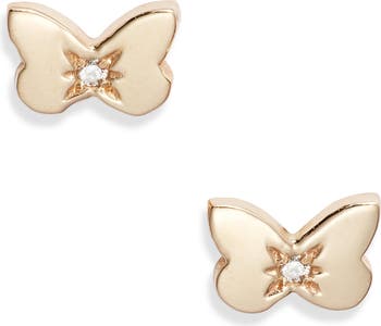 Whimsical butterfly stud earrings of 14-karat gold are finished with twinkling diamonds at the center.