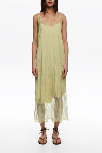 A-line midi dress. Designed with a round neckline and straps with overlaid lace, finished with a lace panel hem with rounded shape
