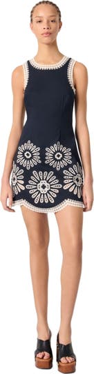 The studio takes us to Italy, from Milan to Lake Como, for a new take on classic elegance and femininity. A dolce vita style with a touch of humour and plenty of glamour, as always. This short, sleeveless dress features contrasting embroidered flowers and scalloped edges. Elegant and structured, it can be worn on its own or layered with matching trousers and wedge sandals.