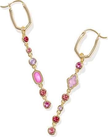 A removable row of twinkling cubic zirconia and pink-hued crystals dazzle elegant huggie hoop earrings in 14-karat gold plate.