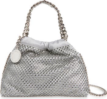 Bezel-set crystals glisten at every intersection of the mesh overlay wrapping this satin version of the Falabella bag detailed with signature diamond-cut chains as both the top-carry handles and removable shoulder strap.