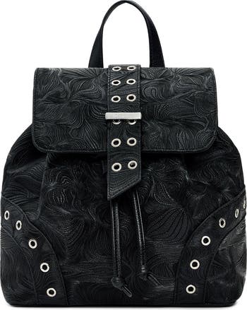 Wave-inspired quilting and polished grommets add unique texture to a mini-sized backpack shaped from sleek faux leather and featuring multiple pockets for easy organization.