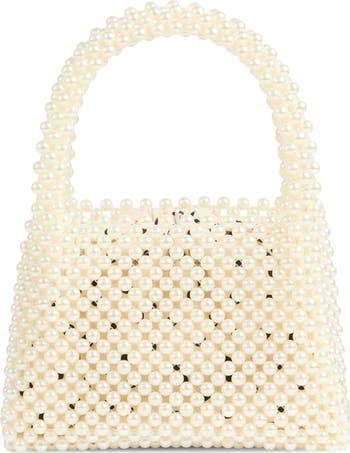 A chainmail-inspired design composed of prim and proper faux pearls reveals the floral-patterned drawstring pouch housed within this ultramini tote.