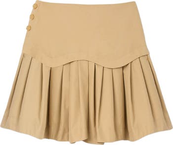 Short flared skirt with decorative press studs on the sides and a voluminous pleated hem.