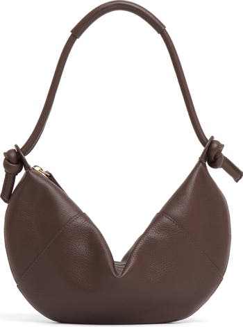 A slouchy crescent silhouette that calls to mind a fortune cookie defines this Italian-calfskin bag topped with a knot-secured shoulder strap.