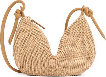 A slouchy crescent silhouette that evokes a fortune cookie defines this woven raffia bag topped with a knot-secured tubular suede shoulder strap.