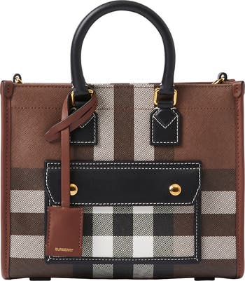 A compact tote bag made in Italy from a Burberry Check coated cotton blend, trimmed with topstitched calf leather and lined in cotton. Inspired by an archival design, it features a magnetic front pocket.||Rolled leather top handles|Detachable, adjustable leather strap|Press-stud closure|Exterior flap pocket with magnetic closure, interior slip pocket|Hand-painted edges|Polished metal hardware|Luggage tag|Embossed Burberry lettering at tag|Cotton blend lining|Comes with a dust bag