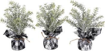 Decorate your holiday with a touch of winter magic using this set of mini artificial Christmas trees. Standing at 9 inches tall, this set of 3 trees features lifelike frosted branches and a classic black and white plaid fabric base. Perfect for tabletops, mantels, or any cozy corner that needs a festive touch, these trees bring the enchantment of a winter wonderland right into your home. Enjoy the magic of the season with these charming and compact Christmas trees. Product Features: Set of 3 mini pine trees Unlit Accented with faux snow for a frosted look 9 tips PE molded tips for a realistic look Black and white plaid fabric base For indoor use only Dimensions: 9"H x 6.5"W x 4"D Material(s): PE/fabric Note: Set of 3 includes; 3 mini trees Note:Branches are compressed for shipment, and need to be fluffed out upon arrival to look like the photo.