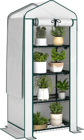 Discover the joy of year-round gardening with the Outsunny Greenhouse! Designed with a mesh roof for optimal ventilation and natural rainwatering, it features a four-tier plant shelf for spacious growth. The 140 gsm PE cover provides UV protection while allowing plenty of sunlight, and the roll-up zippered door ensures easy access and enhanced airflow for healthy plants. Great for any small plastic greenhouse enthusiast looking to create a portable garden oasis!
