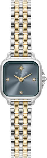 Sparkling crystal hour markers and a square face enhance the polished look of this opulent bracelet watch inspired by the historic landscape of London.