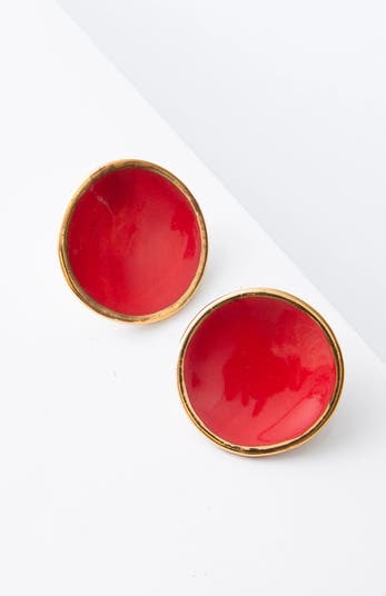 Handcrafted in Thailand, these porcelain post earrings are composed of a circle of brilliant orange-red porcelain rimmed in gleaming gold luster. Their surgical steel posts make these minimalist statement earrings perfect for sensitive ears.