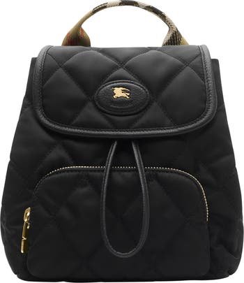 Inspired by country pursuits, the Horseshoe backpack is made from quilted nylon woven with the Burberry Check in a teacup pink colourway. The compact design is detailed with leather trims and our Knight stamp, an archival motif first seen on Burberry bags in the 1980s. Use the D-ring at the side to personalise with charms.||Webbing top handle|Adjustable shoulder straps|Foldover top with drawcord and magnetic closure|Exterior zip pocket, interior slip pocket|Brushed metal hardware|Leather patch with Equestrian Knight Design at front|Nylon lining|Comes with a dust bag