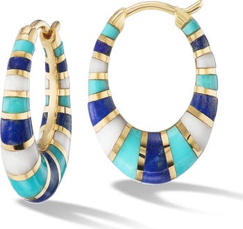 Gorgeously rendered hoop earrings showcase a shimmering assortment of turquoise, lapis lazuli and white onyx stone inlays interspersed with 18-karat gold bands.