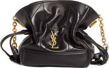 The label's carré rive gauche topstitching creates a geometric patchwork on this mini version of the fan-favorite shoulder bag designed with drawstrings to expand or cinch the silhouette. An iconic Cassandre monogram and removable chain-and-leather strap complete the look.