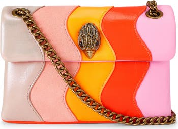 Mixed textures and wavy stripes highlight the colorful exterior of a fierce leather bag suspended from a pull-through chain strap perfect for shoulder or crossbody wear.