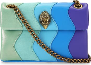 Mixed textures and wavy stripes highlight the vibrant exterior of a fierce leather bag suspended from a pull-through chain strap perfect for shoulder or crossbody wear.