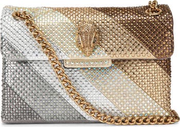 A signature crystal-encrusted eagle head and lustrous jewels embellish a compact crossbody bag fashioned with a convertible chain strap for versatile styling.