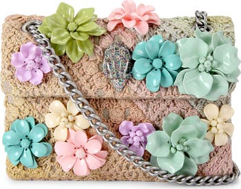 A signature eagle head sparkles amongst a garden of floral appliqués on this delectably woven crossbody bag fitted with a convertible chain strap for easy wear.