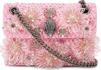 Lustrous embellishments and floral appliqués bring a dose of whimsy to the raffia exterior of a sized-down bag suspended from a pull-through chain strap that converts for shoulder or crossbody wear.