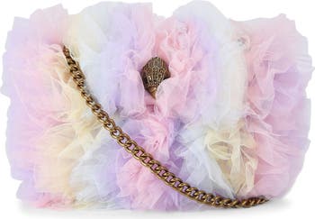 A striking, compact evening bag is made from ruffled tulle in rainbow hues and branded by a crystal-embellished eagle head. The pull-through crossbody chain strap that can be worn doubled or extended adds styling versatility.