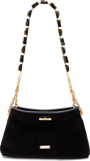 Glinting hardware and ornamental rocks highlight the sized-down profile of a leather bag featuring a pull-through chain strap for on-the-go convenience.