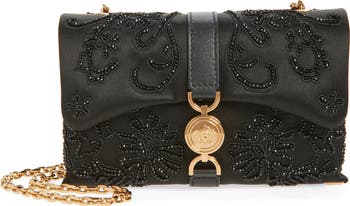 The label pays homage to its archival styles with this '95-inspired satin wallet on a chain elevated with floral embroidery and beaded accents.