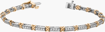 A classic with a twist — Our Mini Lab Grown White Sapphire X Tennis Bracelet pairs rows of round lab grown White Sapphires with signature gold “X” accents, creating a striking pattern that balances boldness with elegance. It's a statement piece you'll keep reaching for, day or night.