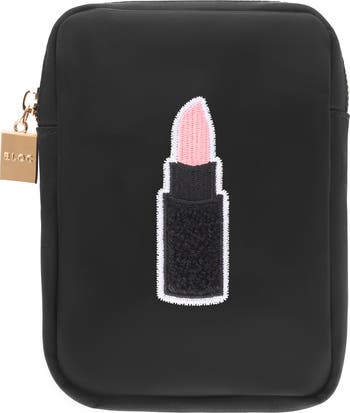 What it is: A playful nylon cosmetics bag featuring a chenille pink lipstick patch at the front.