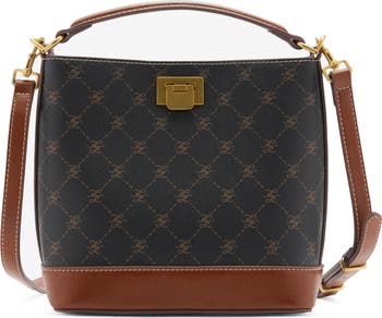 A monogram print patterns the textured faux leather of this shopper-inspired handbag furnished with a removable crossbody strap that offers an added carrying option.