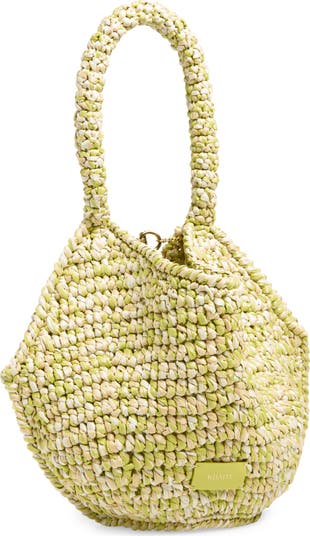 The scaled-down version of the brand's iconic bag retains the original's fluidly shaped silhouette in a chunky weave of electric-lime raffia.