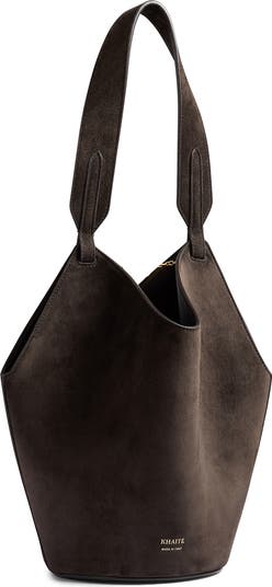 Featuring a sculptural design inspired by the silhouette of a scarf, this scaled-down tote is shaped from Italian suede and stamped with a glinting goldfoil logo.