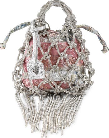 Intricate crystal-embroidered macramé wraps a jacquard underlay on this mini drawstring bag that brings illuminated texture to your night-out look.