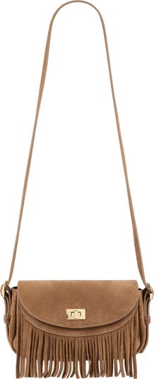 Le Mini Mambo bag in fringed suede, featuring a double flap with a swivel clasp and an adjustable shoulder strap for shoulder or crossbody wear.
