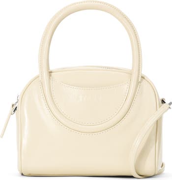 Debossed logo detailing makes a signature statement against the richly textured leather of a scaled-down bowler bag fitted with rolled top handles and an optional crossbody strap.