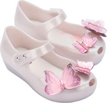 Pretty butterflies set at the toe of a little mary jane flat featuring an easily adjustable hook-and-loop strap for a comfy fit.