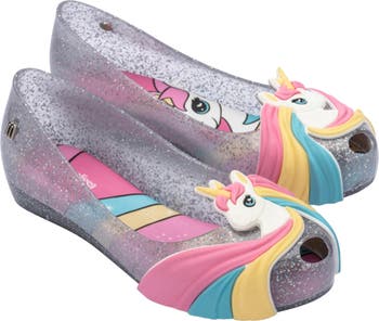 Glitter, rainbows and unicorns bring an air of enchantment to this jelly-style flat crafted from signature fruit-scented PVC.