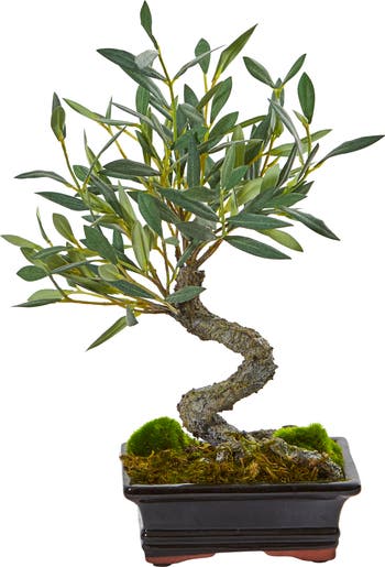Standing at 14 inches, the artificial mini olive bonsai tree features small light and dark green foliage that sits atop a life like twisted stem. Its placed in a traditional planter with natural moss. Realistic in appearance, it'll look great as a centerpiece on your mantel or placed on the corner of your desk.