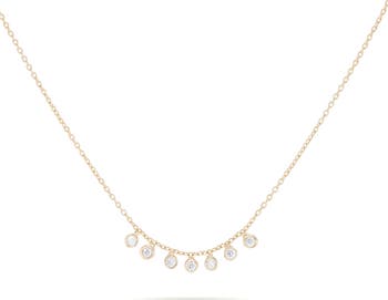 A collection of bezels are filled with lab-grown cubic zirconia in this dainty necklace plated in 22-karat gold.
