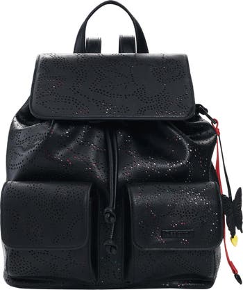 An allover perforated design adds unique texture to a mini-sized backpack featuring a plethora of pockets to tote around your essentials.
