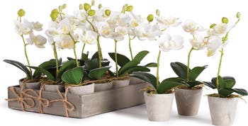 This sweet set of potted pure white mini orchids come in their own rustic wooden tray. Great for hostess gifts or wrap a name tag around each and use as charming place cards.