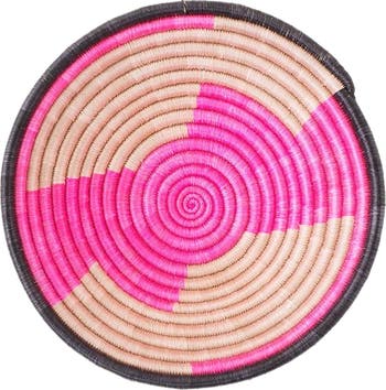 Our mini plateau baskets are multifunctional home decor pieces handwoven in Rwanda. Style the Mini Pink Geo Plateau on a bookshelf, mount on a gallery wall, or give as a housewarming gift....the possibilities are endless! 8" W x 2" H Hand dyed in pink and accented with black Made from strands of sisal wrapped around bunches of sweetgrass Includes a loop on the back for hanging Made from locally sourced fibers The ideal housewarming, wedding, or baby shower gift in a perfect accent size! *Due to the handmade quality, some size and color variation may occur.