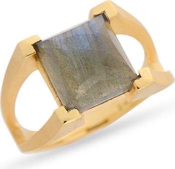 A hand-cut labradorite stone makes a romantic statement on this stackable signet ring featuring a cutaway band plated in radiant 22-karat gold.