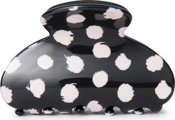 - Jet acetate with abstract blush polka dots Measures 2" by 1" Spot clean, store in resealable striped plastic pouch