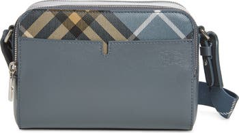 This compact crossbody bag is made from calfskin leather with a pop of Burberry Check in summery wave blue and features an adjustable webbed strap and is subtly branded with an embossed Equestrian Knight Design.