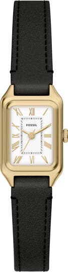 A diminutive version of the brand's classic tank watch boasts big style in a refined art deco motif framed simply and elegantly by a black leather strap.