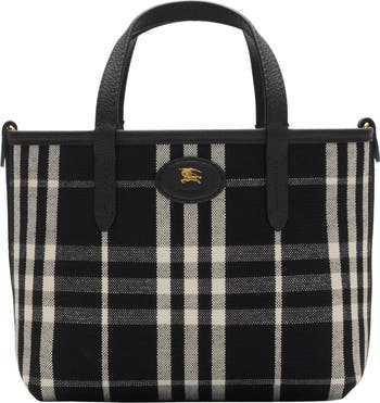 A mini tote made in Italy from grainy calf leather, reversing to a Burberry Check cotton linen blend in a seasonal atom blue colourway. The Bloomsbury collection is finished with a leather and metal Knight stamp, an archival motif first seen on Burberry bags in the 1980s. Carry by the top handles or across the body using the detachable strap.||Top handles|Detachable, adjustable strap|Hand-painted edges|Brushed metal hardware|Leather patch with Equestrian Knight Design at front|Comes with a dust bag