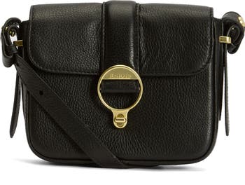 Full-grained natural leather and aged-finish hardware bring rich texture to a structured crossbody bag featuring signature plaid lining and suspended from an adjustable strap.